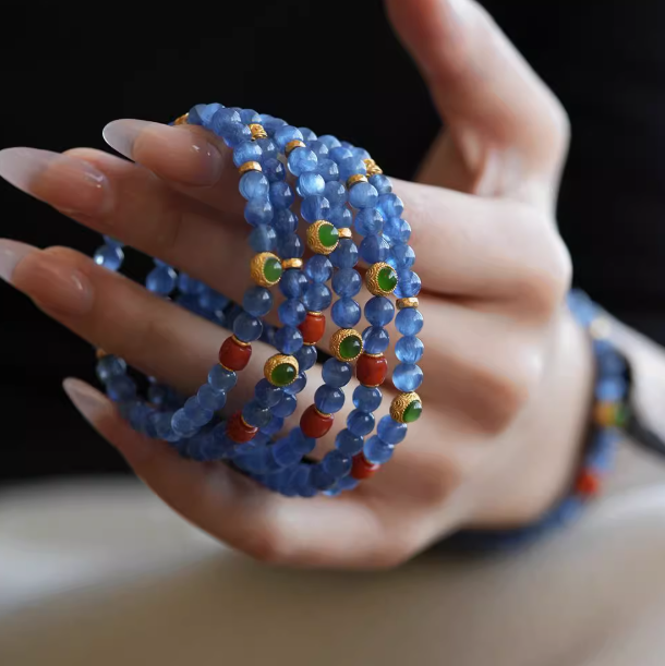 Embrace the calming yet empowering energy of this exquisite Natural Kyanite Crystal Bracelet. Each bead is meticulously selected from 100% genuine, high-grade Kyanite, showcasing its mesmerizing natural blue hues—ranging from sky blue to deep indigo—often with fascinating internal striations that reflect its unique crystalline growth. Kyanite is revered for its ability to promote mental clarity, enhance intuitive abilities, and facilitate calm communication, guiding you towards profound inner peace and self-expression.